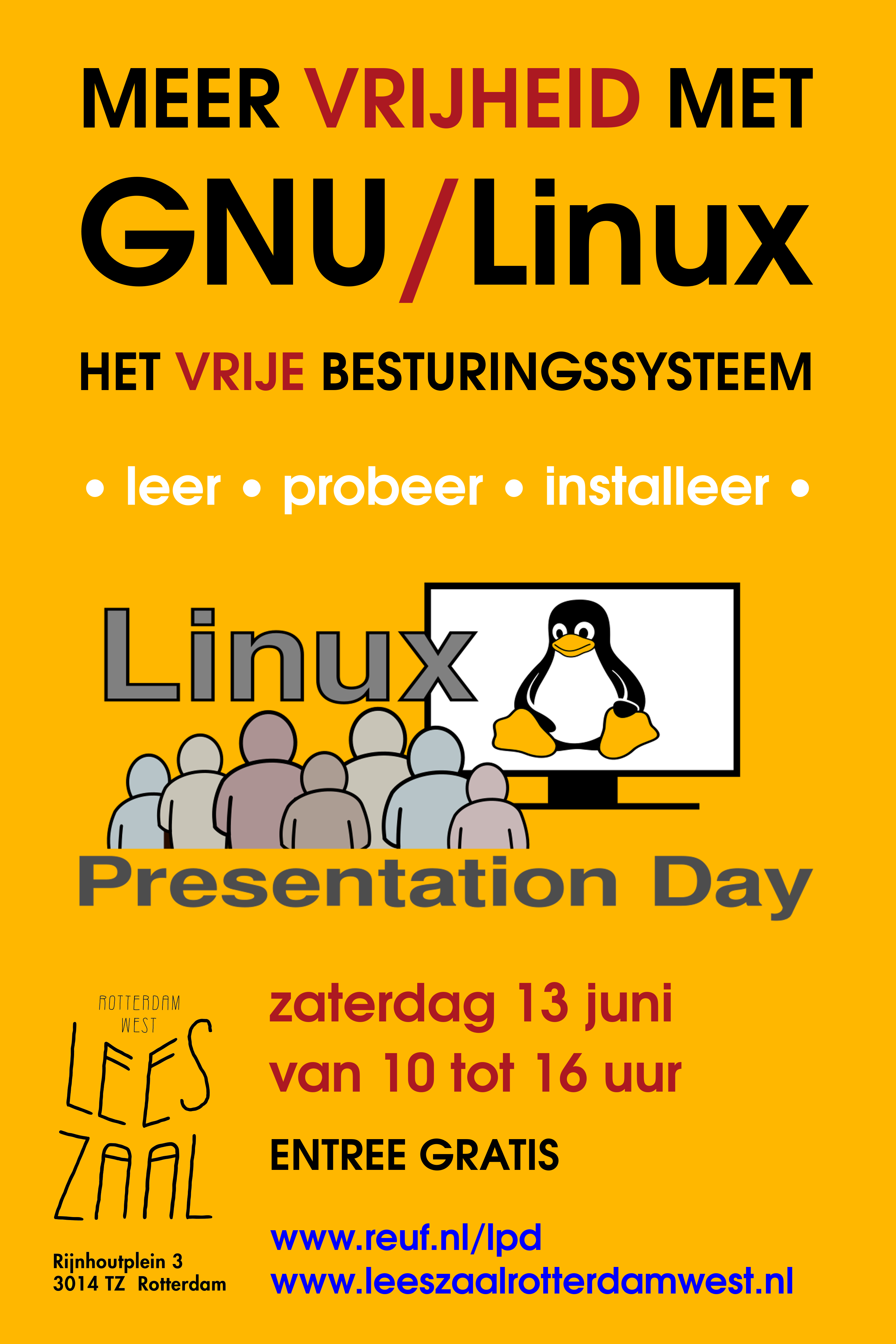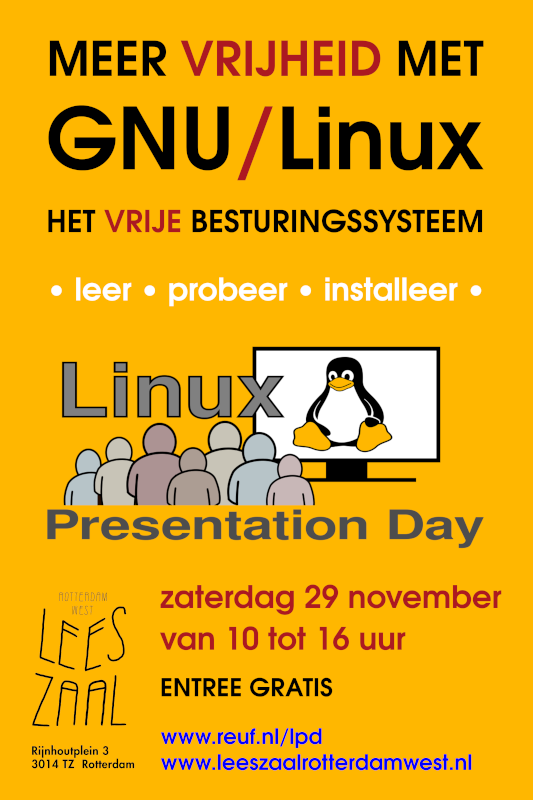 Wil je reclame maken voor Linux Presentation Day? Maak gerust gebruik van onze flyer of poster:
